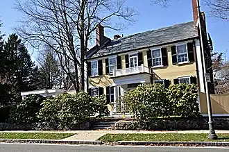 The Robert Bacon House stands in southern Winchester, on the west side of Mystic Valley Parkway near the point where the Aberjona River empties into the Upper Mystic Lake. It is a 2+12-story wood-frame structure, with a side-gable roof and clapboarded front and back. The side walls are built out of brick, rising to a parapet and two end chimneys. Its front facade is five bays wide and symmetrical, with the center entrance sheltered by a portico supported by fluted Doric columns and topped by a balustrade. The entry is framed by sidelight and transom windows with tracery. The interior also retains high quality wood work from its period of construction.[2]