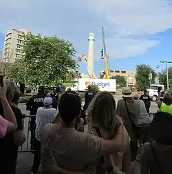 On May 18, 2017, the City of New Orleans announced the statue of General Robert E. Lee would be removed the next day.[37][38] On May 19, 2017, following a day long effort by work crews, just after 6 o'clock p.m. the statue of Lee was finally detached and then removed and lowered by crane from its column pedestal to a semi-trailer truck and transported to storage.[39][40][41]