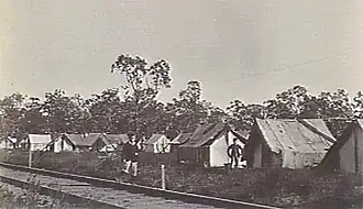 Burns was probably attracted to the Hamilton and Stawell districts by the proliferation of work opportunities offered by the construction of railways in the colony of Victoria. The rail link from Ballarat to Ararat opened in April 1875, leading to further railway works in the Ararat district as the township developed into a major rail junction.[10] In February 1876 the railway line from Ararat, north-west to Stawell was opened.[11] This line was extended to Murtoa in December 1878.[12] In April 1877 a railway to the south-west was opened, joining Ararat with Dunkeld. This line was later extended to Hamilton and Portland.[13] The railway worker, or navvy, was employed by contractors to provide the manual labour to fell trees, lay sleepers and tracks, excavate cuttings and construct embankments. The workers lived in tent camps, with only basic necessities, located near the construction works.[14][15]
