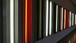 Irwin first used fluorescent light in the 1970s.[5] His site-conditioned installation Excursus: Homage to the Square3, a meditation on the painter Josef Albers and his explorations of color relationships,[6] was presented at Dia:Chelsea between 1998 and 2000. It consists of 18 small rooms, divided by walls of tautly stretched scrim; the light in each room, its value depending on the distance from the windows, is enhanced by four white-and-colored double fluorescent bulbs, each hung vertically at the center of each wall.[6] In 2015, it was reinstalled at Dia:Beacon where it was on view through 2017.[5] For a 2015 exhibition at Pace Gallery in New York City, Irwin installed rows of columnar lights, coating the different tubes with colored gels that alter the transmission of light.[5]