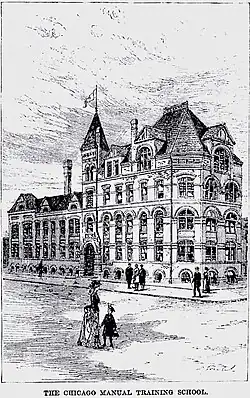 Seyfarth began his architectural education at the Chicago Manual Training School, which was founded by the Commercial Club (after 1907 The Commercial Club of Chicago) [22] out of a concern for the quality of the education of skilled labor in the Chicago region. The school had opened its doors on January 4, 1884 with four teachers and seventy-four pupils and the support of the sixty members of the club who had "pledged themselves to found a manual training school, and guaranteed for its construction, equipment and support [with] the sum of one hundred thousand dollars".[23] The club, which was founded in 1877, was a group of the city's most influential leaders that included Marshall Field, George Pullman, Edson Keith, Cyrus McCormick and George Armour. The club's successor, The Commercial Club of Chicago would later sponsor Daniel Burnham and Edward H. Bennett's Plan of Chicago (1909), which is widely regarded as one of the most important public planning documents ever created. Chicago Manual Training School was a private secondary school and was designed to graduate its students three years from the time they entered. The student body, which was all male, was required to spend an hour each day in the drafting room and two hours a day in the shop, in addition to the time spent in classrooms studying the conventional high school curriculum. In 1891 the tuition averaged $100.00 per year "to those able to pay it".[24][25] In 1903 the institution became part of the University of Chicago Laboratory Schools,[26] operating out of CMTS (later Belfield) Hall.[27]