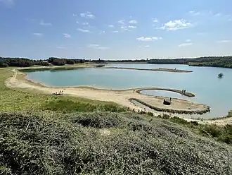 In 1971 Smithson created Broken Circle/Spiral Hill in Emmen, the Netherlands[25] as part of the Sonsbeek art festival. The subject of the 1971 Sonsbeek exhibition was Beyond Lawn and Order (Dutch: Buiten de perken). The Broken Circle earthwork was built in a quarry lake 10-to-15 feet deep. It was 140 feet in diameter, with the canal 12 feet wide, and built of white and yellow sand. The accompanying Spiral Hill is made of earth, black topsoil, and white sand, and is 75 feet in diameter at its base.[8][26] The work is still being maintained and occasionally opened for visitors.