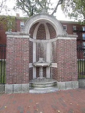 The brick-and-stone drinking fountain was designed by Alexander Wadsworth Longfellow Jr. and erected in 1910 in memory of R. S. Bradley Jr., who graduated from Harvard College in 1907 and died later that year.[1][2][3] The inscription reads: