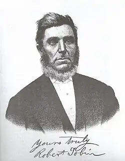 Robert Tobin (December 7, 1815 - July 8, 1898) from Tobinsport, Indiana[1] was the grandchild of George Tobin, one of the first pioneers to settle in Perry County. George had negotiated the land rights of his property with the local Native American chiefs.[1] When hearing that Gilbert du Motier, Marquis de Lafayette's ship had sunk on the Ohio River during his 1825 tour of the united states, Robert, then 10 years old, walked with his parents to meet with the Marquis.[2] Robert was educated in a log cabin and eventually became a very successful businessman and farmer.[1][2] He would eventually own upwards of 1,000 acres of land in Perry County. On October 8, 1840, Robert married Jane Blaine from Breckinridge County, Kentucky.[1][3]