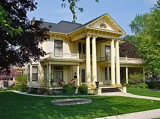 The Wagner home was designed in the Neoclassical style by Frederick G. Clausen of Davenport, Iowa and was built in 1904.[2] It features a three-bay front façade with a central entrance, a balcony, and a two-story portico. The pediment above the porch is supported by pairs of fluted Ionic columns. Bracketed eaves extend along the cornice below a deep overhang. Larger brackets support the entrance balcony. Galleries with turned spindles and urn-shaped finials flank the entrance. The gallery on the north is extended to form a porte cochere. On the north side of the home is a beveled and leaded stairway window. A two-story bay on the south side features a “bottle glass” window. On the interior, the grand staircase features a semi-circular balcony. Original mechanical devices in the home include a speaking tube, doorbell system and a corner light system.[2][4]