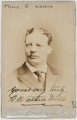 Born in Painswick in Gloucestershire, he was the son of Mary Watkins (born 1817) and Thomas Mills (1819 – 1883). In 1869 he married Elizabeth Hore (1850-after 1891).[1] Robert Watkin-Mills studied singing with Samuel Sebastian Wesley in Gloucestershire, Edwin Holland in London, and Federico Blasco in Milan. He made his professional singing debut at The Crystal Palace in May 1884 in a concert with Sims Reeves. In 1886, he sang the role of the Forester in the premiere of Arthur Sullivan's cantata The Golden Legend at the triennial Leeds Festival. He also sang in the 1893 premiere of Ethel Smyth's Mass in D at the Royal Albert Hall. He had a successful career in Great Britain, the United States (he returned almost every year from 1894), and in Australia from 1904 to 1905.[2] In Canada he appeared with the Montreal Philharmonic Society and other musical societies, specialising in the concert platform and in oratorio, especially in such works as Handel's Messiah and Judas Maccabaeus.[3]