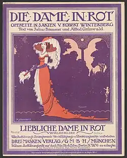 Winterberg's early operettas in Vienna were not particularly successful, and he relocated to Berlin in hopes of achieving better success in that city.[3] There, he had his first major success as a composer with the operetta Die Dame in Rot at the Theater des Westens in 1911.[4] Well received, the work enjoyed popularity both in Germany and abroad. American playwright Anne Caldwell adapted it into an English language version for Broadway entitled The Lady in Red which starred Adele Rowland. It was performed at the Lyric Theatre in 1919 prior to going on a national tour.[2]