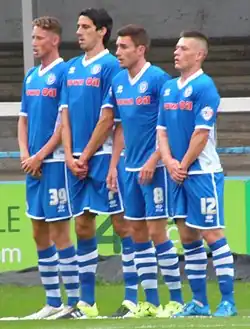 Rochdale players Joe Bunney, Peter Vincenti, Matty Lund and Donal McDermott line-up in a wall against Blackburn Rovers in July 2015