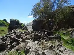 The drilled holes and remnant rock bolts exposed in the rock faces of Lambie Gorge are evidence of where "pull-out" tests were undertaken to prove a rock-bolt anchorage that was as strong as the bolt itself.[1]
