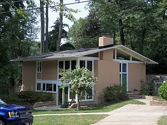 The Rock Creek Woods Historic District is a national historic district located north of Kensington, Montgomery County, Maryland (although the postal address is Silver Spring). This suburban development, consisting of 74 Contemporary houses, is nestled in a wooded valley between two creeks near Connecticut Avenue (MD 185). These houses were designed by Charles Goodman and built between 1958 and 1961 by Herschel and Marvin Blumberg, developers of New Town Center in nearby Hyattsville, Maryland. The original layout, including roads, lot configurations, and sidewalks, remains unaltered. During the 1960s, the neighborhood was home to a significant Jewish population and many people in the neighborhood were active in liberal causes, particularly the peace movement. [2]