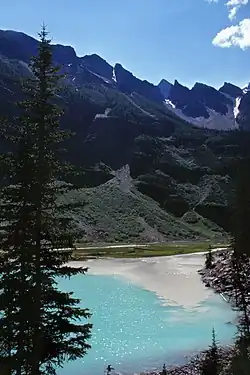Rock flour, or glacial flour, consists of fine-grained, silt-sized particles of rock, generated by mechanical grinding of bedrock by glacial erosion or by artificial grinding to a similar size. Because the material is very small, it becomes suspended in meltwater making the water appear cloudy, which is sometimes known as glacial milk.[1][2]