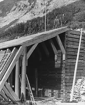 In early February 1885, three avalanches struck. At MacKenzie camp, 6 miles (10 km) west of the summit, a worker was buried. At McDermot camp, 2 miles (3 km) away, three buried men were never found. At the summit, three occupants escaped through a camp store window. Later that month avalanches totally destroyed the store, and buried six men in the vicinity.[30] These slides, followed by heavy summer rainfall, delayed the work.[27] Abandoning the damaged right-of-way on the western slope, north of the river, CP built the switchback loops well clear of avalanche paths.[31][32]
