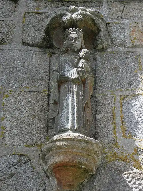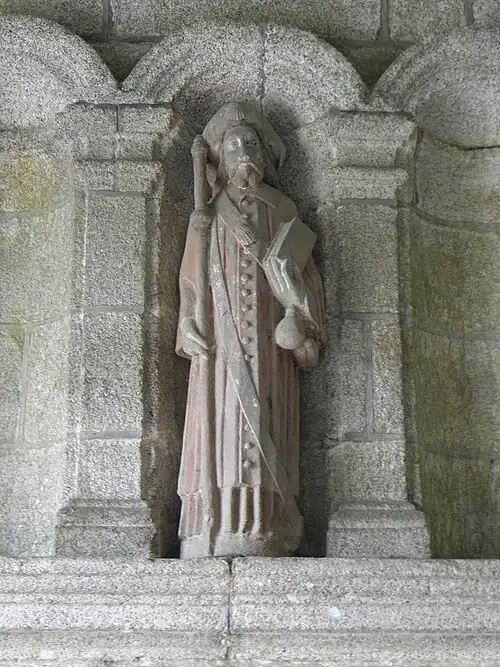 For the south porch of the Saint-Yves church in Plounéour-Ménez, Doré executed two statues of John the Evangelist and Saint Thomas. He also worked on part of the calvary with back-to-back statues of the Virgin Mary and Saint Peter and John the Evangelist and Saint Paul.[21] The atelier also worked on the Kersimonet cross executing a statue of the Virgin Mary with child.[22] Finally in Plounéour-Ménez, the Dorė atelier are credited with execution of a calvary at the "manoir du Penhoat". On the fountain there Saint Francis of Assisi and Saint James the Greater's statues are all that remain of a calvary.[1]