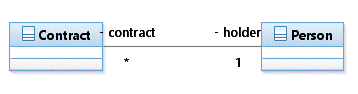 Then you realise that as a contract holder, the Person has specific attributes. The holder UML role becomes a dedicated class ContractHolder with these specific attributes. Note that in that case that the multiplicity near Person and Contract are always 1. It means that you've one ContractHolder object for each association between a Contract and a Person.