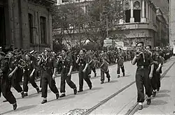 In December 1936 Oyarzun published a press article titled Una idea: Requeté y Fascio; most authors claim it advanced an idea of a union between the Carlists and the Falangists,[89] though few maintain that it rather highlighted the differences.[90] Until some time in 1937 he believed in birth of a foral corporative regime,[91] yet also following the Unification Decree he remained entirely loyal to the emerging Francoist system and occasionally published pieces looking like a praise of Carlist identity within the new national conglomerate.[92] At that time he was already part of the new administration. In late 1936[93] Oyarzun was nominated Presidente del Comité Ejecutivo de Comercio Exterior,[94] a unit within the Francoist quasi-ministry of economy.[95] Its task was to control private foreign trade by means of licenses;[96] CECE operated until March 1938, when its duties were taken over by Comisión Reguladora.[97] It is not clear whether Oyarzun joined the body; he was rather noted for presence in other minor economy-related institutions.[98] In 1939 he resumed consular service, posted to Perpignan.[99] It is known that his assignment did not expire before 1944.[100]