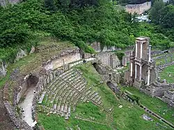 The Roman theatre of Volterra was uncovered in the 1950s, during archaeological excavations of the ancient Roman city conducted by Enrico Fiumi. 19th-century guide to the city mentions efforts in 1817 by the commune to start excavating what was considered a luxurious amphitheater at this site.[1] It is one of the best-preserved Roman theatres in Italy.[2] It is located just outside the Porta Fiorentina, in an area called Vallebuona.[3]