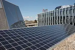 The partnership between the company and the school also includes a share of research into photovoltaics and its applications. The facility features several technological innovations, including Grätzel cells, flexible panels for use on curved roofs, and vertical panels for building facades.[37]