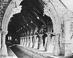 As this location was some distance from the centre of Sydney and from the main-line train station at Haslem's Creek, now Lidcombe station, it was considered necessary to establish a railway station at the centre of the cemetery. This line would run as a spur line from the existing station at Haslem's creek and allow easier movement into and out of the cemetery. The railway line construction began in November 1864 and from 1 January 1865 trains began their run into the cemetery.[5] However, The Sydney Morning Herald advertised the first regular services from 1 April 1867. The times advertised were for services at 8.30 am and 4.15 pm. Later this was changed to 9.15 am and 3 pm.[6] It stopped at prearranged stations on the journey from central Sydney in order to pick up mourners and coffins.[5] Some stations, such as Newtown had special platform areas and buildings reserved for mourners and coffins.