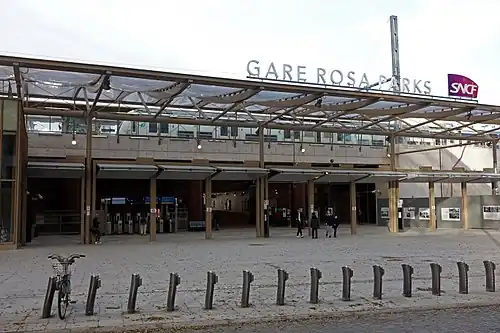 Rosa Parks station (French: Gare Rosa Parks) is a railway station in the 19th arrondissement of Paris, France near the Porte d'Aubervilliers. It is on the RER network, and also has a tram stop. The station opened on 13 December 2015, and bears the name of American civil rights activist Rosa Parks.