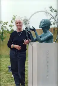 In 1995 Garrard moved her studio from London back to the Malvern Hills. In response to local newspaper appeals for ideas to help regenerate Great Malvern, she proposed “The Spring Water Arts Project”, the creation of a new sculpture trail to reclaim lost spring sites throughout the town.[4] Among her sculptures created after her move back to the Malvern Hills are the Enigma Fountain including the statue of Sir Edward Elgar (Unveiled by The Duke of York on Belle Vue Terrace, Great Malvern on 26 May 2000).[7] Its cost of £50,000 was funded by the Malvern Hills District Council, public subscription, and support from by West Midlands Arts, Severn Trent Water, and local businesses. Other works include the drinking spout, Malvhina, which was unveiled on 4 September 1998, the Hand of Peace war memorial, a sculpture in Portland stone located in the Barnards Green suburb of Malvern,[8] Women's Work 1998, in Bilston, Wolverhampton, England, created in bronze, Welsh slate, and brick,[9] and the Cascade Gates 2007, in welded steel at the Clock Tower Well Room in North Malvern.