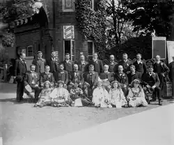 A formally posed group of men and girls at the main entrance, in 1909