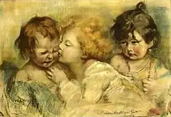 Gutti was born in Rome, then part of the Papal States. Her work The Peacemaker was included in the book Women Painters of the World.[1] This became a popular print and was the primary illustration on an Australian poster for WWI war bonds.[3] The image was also used on a Canadian WWI poster "For Your Children Buy War Savings Certificates and they will live to thank you". A sketch of this group titled "Three infants" is in the collection of the British National Trust.[2]