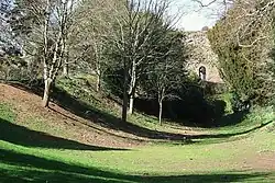 The whole of the gardens, including the castle and city walls, Athelstan's Tower and the gatehouse are scheduled as a nationally important archaeological site,[4] and are maintained as a public open space by the city council.[6] Until 2009, they were used by the Northcott Theatre to stage Shakespearean plays in the summer—the city wall and defensive ditch forming a natural backdrop and amphitheatre for the performances.[7][8]