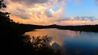 The Rough River Lake is a Y-shaped reservoir located in Breckinridge, Hardin, and Grayson counties in Kentucky, United States, about 70 miles southwest of Louisville.[1] This lake was created by the building of a dam, begun in 1955 and completed in 1961, 89.3 miles (143.7 km) above the connection between the Rough River and the Green River. The land and water, along with the wildlife, fisheries, and recreational activities, are all managed under the cooperation of the U.S. Army Corps of Engineers and the Commonwealth of Kentucky. A primary attraction is Rough River Dam State Resort Park.[2]