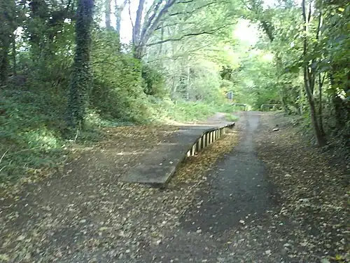 The track was taken up in 1982 and the trackbed became part of a shared-use path in the mid-1980s. The platform and the yellow single arm lower quadrant type signal are extant.[2]