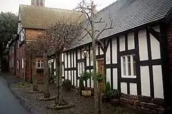 Egerton-Warburton also paid for the construction of secular buildings in villages on his estates, many of which were designed by John Douglas. In Great Budworth he had a "campaign to restore the village and render it picturesque in Victorian eyes".[15] He restored many of the cottages in the village and built new ones to blend with them.[16] In 1875, the George and Dragon, a simple three-bay Georgian inn in the village, was remodelled by adding ribbed chimneys, moulded brick mullions, an elliptical-headed doorway and a steep pyramid-shaped turret.[17] The village has changed little since then and it remains "one of Cheshire's most charming villages".[16] In 1873 he paid for the building of a cottage in Arley Green[18] and founded Arley School in the village.[19] In Warburton, he paid for a school in 1871–72,[20] a church hall in 1889,[21] and a post office in 1893.[22] Features in the style of Douglas were added to the timber-framed Bent Farm, which stands opposite the new church, in 1880.[10][23] He also built the public road from Arley Hall to Appleton Thorn.[8]