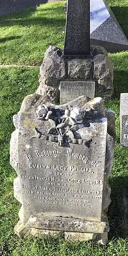 Monumental inscription: In loving memory of / Evelyn Lucy Phillips / widow of / Captain Francis Michael Goold Adams R.A. and wife of / Harry S.F. Jebb of Tullich Lodge Ballater N.B. / born 8 May 1861 passed away 2 March 1907 / whom God's hand rests on / has God at his right hand[10]