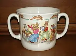 Royal Doulton Bunnykins tableware and figurines are popular ceramic designs manufactured as nursery dishes and collectible figurines. The chinaware line originated with artwork by Sister Mary Barbara Bailey (née Barbara Vernon Bailey), the daughter of Cuthbert Bailey, general manager of Doulton during the 1930s. Unbeknownst to the public, Mary Barbara Bailey was not a professional illustrator, but a nun in the Augustinian Canonesses of the Lateran.[1] Sister Mary Barbara provided illustrations to the designers of Doulton & Co. to be used on tableware. Six Bunnykins figurines were produced based on Sister Mary Barbara's illustrations in 1939 and were designed by Charles Noke. Discontinued during World War II, Bunnykins figurines were not reintroduced until 1969. Bunnykins continued to be produced in England until 2005. Bunnykins figurines and tableware are currently produced in Asia.