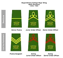 Every Company is led by one Senior Under Officer (SUO) and assisted by three Junior Under Officers (JUOs), who are fourth year Puteras appointed by the college administration. The terms SUO and JUO are a throwback to the traditions of the Royal Military Academy at Sandhurst, where such titles are still in use today for senior rankholders. Fourth year Puteras who are not rankholders are entitled to be referred to as Senior Puteras (SP).