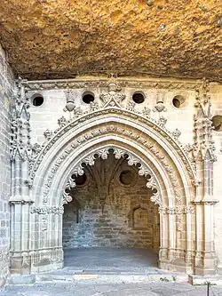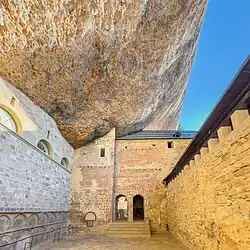 The monastery of San Juan de la Peña (Spanish: Real Monasterio de San Juan de la Peña) is a religious complex in the town of Santa Cruz de la Serós, at the south-west of Jaca, in the province of Huesca, Spain. It was one of the most important monasteries in Aragon in the Middle Ages. Its two-level church is partially carved in the stone of the great cliff that overhangs the foundation. San Juan de la Peña means "Saint John of the Cliff".