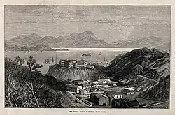 The RNH began in 1841 in a matshed on the site of the Wellington Barracks on Hong Kong Island. In early 1841, Hong Kong was occupied for the first time by British. During the same month, the Navy constructed makeshift structures, such as store sheds and a naval hospital, to serve their needs.[1] A typhoon destroyed the hospital and it was temporarily located on HMS Minden, a third-rate sailing ship. This ship was replaced by HMS Alligator in 1846, a sixth-rate frigate and HMS Melville, another third-rate sailing ship in 1857.
