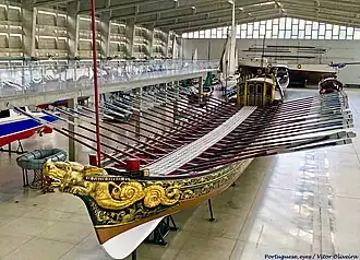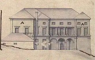 The 18th century was the heyday of the royal palace of Salvaterra de Magos. It was a favored palace, which was visited by the royal family on many occasions, primarily during the winter up to Carnival.[1][5] They often would come by barge from the Ribeira Palace in Lisbon over the Tagus river to Salvaterra de Magos (the barges used can now be visited in the maritime museum of Lisbon).[1] Also, the palace was further expanded and remodeled. King Joseph I (1714–1777) orders the construction of an opera house.[1] The architect Carlos Mardel assisted with the design.[6] It is inaugurated on 21 January 1753 with the opera ‘Didone Abandota’.[6] In the next 39 years between 1753 and 1792, numerous opera performances were to follow (according to some 64 different shows).[7] Also, Carlos Madel created a new falconry building.[8] Falconry at Salvaterra de Magos had its heyday in 1750s with the arrival of a dozen Dutch falconers from Valkenswaard, who were to instruct the local falconers with the art of Dutch falconry.[8] The 1755 Lisbon earthquake seriously damaged the palace.[1] However, reconstruction and renovation works started soon in the years following.[1] A new bullfighting arena was constructed next to the royal palace in 1775.[1]