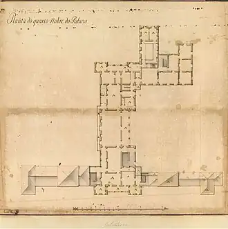 In the start of the 16th century, King John III of Portugal (1502–1557) awarded the estate of Salvaterra de Magos to his brother prince Luís of Portugal, Duke of Beja (1506–1555), who constructs (or rebuilds) a new palace with sumptuous gardens.[1][2] After his death, the palace is inherited by his son António, Prior of Crato (1531–1595), who was king of Portugal for 33 days in 1580, and it becomes part of the Portuguese royal domains and estates. The palace is expanded by King Philipp II in 1590 with help of the architect Filippo Terzi[3] aided by the Portuguese architect Baltazar Álvares,[4] who was also responsible for other royal palaces in Almeirim and Santarém.[1] Further expansion happens under King Peter II (1648–1706), who was fond of hunting, starting in 1690.[1][2] His renovations give the palace a baroque touch, which still can be seen in the chapel today.[2]