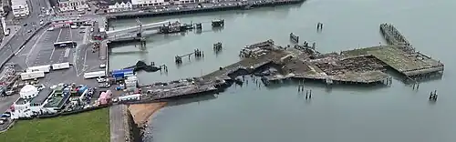 Over a two-year period starting in 1891 the pier was rebuilt in iron and the station was expanded to house two platforms and the facilities to allow the pier to be used as a pleasure pier added.[1] These facilities included a pavilion.[1] The money for the pier's expansion came from part of a loan of £100,000 taken out by the harbour board which was also used to pay for dredging.[7] The rebuilt pier was opened in 1902 by Prince Arthur, Duke of Connaught and Strathearn.[8] In 1894 the gatehouse was expanded and four years later a new pontoon was added to the pier enabling two steamers to be berthed simultaneously.[1] The addition of the new pontoon coincided with the pier being renamed to Royal Pier.[1]