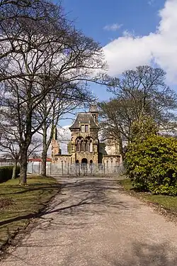 The building initially used for the institution was in Gayfield Square, Edinburgh in 1855 and administered by 'The Society for the Education of the Imbecile Youth of Scotland'.[2] Dr. and Mrs. Brodie educated the children during the time in Edinburgh,[3] however; the building was too small for all the pupils and staff which meant the committee had to look for another site for the institution.[4] It was necessary to find bigger premises for the institution, five acres near Larbert railway station were obtained to build a property and this was founded as the 'Home for Imbecile and Invalid Children' in 1863.[2] The architect for the original building was Frederick Thomas Pilkington,[5] his own house Egremont was started after the building at Larbert was completed, both were the High Victorian Gothic revival style that Pilkington favoured.[6] Pilkington travelled to England to look at the designs of leading institutions there, he drew up plans and estimated the cost of erecting the building to be £1,800.[4] The funds for the building were partly raised by a Ladies' Auxiliary Committee in Edinburgh, who managed to raise £1,350 through mainly small donations.[4]