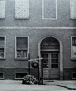 After the Second World War, his apartment was physically located in Mitte, in East Berlin, or the Soviet Sector of Berlin, while the entrance to the building and adjacent sidewalk was located in Wedding, in West Berlin, or the French Sector of Berlin. With the construction of the Berlin Wall, border guards were posted in the hallways and entrances, who checked identity documents of those entering the apartments. On the evening of August 18, five days after the erection of the Berlin Wall, the entrance door, and the escape route to West Berlin was bricked and sealed, with alternate entrances established but leading to East Berlin. According to his wife Ilse, this was the deciding factor for her husband, who was previously hesitant about leaving East Berlin. They attempted their escape the following day, accompanied by his friend and his friend's wife, Willy and Irmgard Kutzminski.[2][3] They chose to rappel from their second floor apartment (by North American standards, first floor/1.Obergeschoss or 1.Stock by European standards), to avoid involving ground floor inhabitants, which could have led to them being accused as accomplices. Both would wind up slipping, and injured themselves at they impacted the sidewalk below. In shock, and having sustained injuries on their hands and feet, and a heel fracture sustained by Rudolf Urban, they were taken to the nearby Lazarus Hospital in West Berlin. Ilse Urban recovered, but Rudolf Urban contracted pneumonia, and died on 17 September 1961.[4][5]
