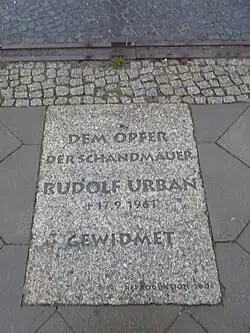 Rudolf Urban was the fourth known of at least 140 victims caused by the Berlin Wall, in order of death, but was the first known victim in order of attempted escape. He was buried at the Dorotheenstädtischer Friedhof II.[5][4] A memorial stone on the Bernauer Straße, near the Swinemünder Straße, which the district office of Wedding 1982 had set up, commemorates his fate and the fate of nine other victims in Bernauer Strasse. His widow, Ilse Urban, was last known to live (in 1985) at Teikeweg 42, in Berlin-Mariendorf.[1][6]