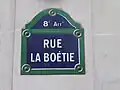 The street took its current name in 1879, throughout its length, in honour of Étienne de La Boétie (1530–1563), friend moralist of Michel de Montaigne.