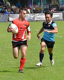 Players running down the touchline during the Singapore Cricket Club Rugby Sevens tournament