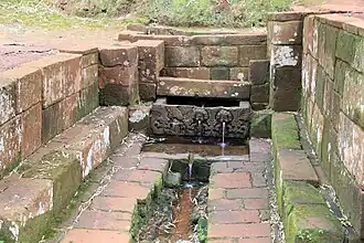 The site covers 38 hectares (94 acres), and from the large original complex a good part of the old church, the bell tower and sacristy, the foundations of the native habitations, some cornerstones of the workshop walls, the convent and other buildings, the square, the vegetable garden and a good collection of sacred objects, mainly devotional statues,[12][28] whose exact original provenance, however, is uncertain, having been collected from all over the surrounding region.[30] The excavations also found a complex underground water system built in sandstone, including emergent structures such as a fountain and paved circular tanks. This fountain, carved with relief mascarons, located a kilometre from the church, survived in good condition concealed by the accumulation of earth and vegetation. It was rediscovered by IPHAN in 1982 and restored in 1993. On the outskirts of the complex, traces of two votive chapels, bread ovens and senzalas survive.[12][28][13]: 112–114 Some fragmentary stone columns, located apart, seem to be the remnants of the trunks where wrongdoers were chastised.[13]: 114