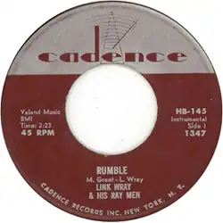Eventually the instrumental came to the attention of record producer Archie Bleyer of Cadence Records, who hated it, particularly after Wray poked a pencil through the speaker cone of his amplifier to make the recording sound more like the live version.[9][10] But Bleyer's stepdaughter loved it, so he released it despite his misgivings.[11] Phil Everly heard it and suggested the title "Rumble", as it had a rough sound and said it sounded like a street fight.[10]