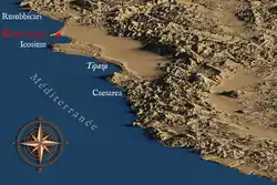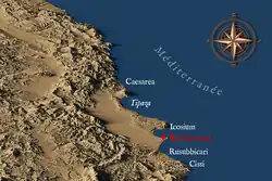Rusguniae, to the north-east of the Bay of Algiers and home to the Punic base of Tamentfoust, takes its name from the expression "Cap du Francolin".[16][17][18] Berbrugger[19] suggests that the origin of the name is a Berber word that was Latinised by the Romans to mean "cape of sleep" or "cape of sleepers", in reference to a local interpretation of the very popular theme of the sleepers of Ephesus. Mouloud Mammeri suggests that Rusguniae is composed of two roots: the Phoenician rus (the cape) and the Berber agouni (the cliff). Salama points out that Rusguniae already existed at the end of the fourth century BC, while the foundation of Icosium cannot be dated before the second century BC.[20] The process of Roman colonisation in Rusguniae seems to indicate competition, with continental rather than maritime interests. The Bay of Algiers provided access to the Mitidja plain and the Chelif valley, which was more accessible from Rusguniae than from Icosium. This, combined with the probably more important status of Icosium, may have led to the choice of Rusguniae for the Roman settlement, thus avoiding direct competition.