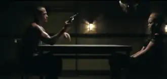 The music video opens with shots of Rihanna hooded, lying on the floor of a gas chamber. Three men, dressed in black uniforms and wearing dark round glasses circulate the singer, attempting to extort information from her. The scene then moves to a dimly lit room in which Rihanna sits at a table with her love interest (played by American actor Jesse Williams) opposite. On the table between them lies a silver revolver in which, throughout the video, they take it turns holding to their heads. Other scenes include Rihanna in woodland at night standing in the middle of a highway before a car speeds towards her, quickly cutting to another scene, giving the impression she is run over. Elements of blood and tears and vehicular assault dominate the video.[68] In the final scenes, Rihanna is shown underwater, floating while being fired at; one bullet is visually seen cutting her throat. The video ends with her lover committing suicide with the revolver placed between them.[70][71]
