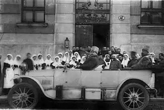 Soon after Russian soldiers crossed into eastern Galicia, the Holy Synod of the Russian Orthodox Church met in a special session to discuss how to organize the religious life of the "Russian population" of Galicia. Evlogii, the archbishop of Volynia and Zhytomir, was appointed to lead Orthodox missionary work in Galicia.[8] The ultimate Russian goal with respect to the Ukrainian Catholic Church that dominated Ukrainian religious life in Galicia was its complete destruction.[9] The popular head of the Ukrainian Greek Catholic Church, Metropolitan Andrey Sheptytsky, perceived as a "father figure" by most Galician Ukrainians,[10] was arrested and imprisoned in an Orthodox monastery for delinquent priests in Suzdal. The Metropolitan's imprisonment caused angry questions to be raised by members of the Opposition in the Duma and diplomatic protests from both the Vatican and the United States.[8] While Tsar Nicholas II issued a decree forbidding forced conversions from Catholicism to Orthodoxy, except in cases where 75% of the parishioners approved,[11] hundreds of Ukrainian Catholic priests were exiled to Siberia and replaced by Orthodox priests, who then demanded that the parishioners to convert to Orthodoxy and speak only Russian. Tsarist authorities were so obsessed with converting Byzantine Catholics to Orthodoxy that army chief Russian Grand Duke Nicholas complained that ammunition trains desperately needed by the Russian army were being commandeered for the purpose of transporting Russian priests into Galicia.[12] More than anything else, Russian persecution of the Ukrainian Catholic Church turned Galician peasants and even formerly Russophile intellectuals against the occupation.[8][13]