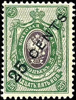 Although the offices had always accepted Chinese currency at par, a Chinese cent being considered equivalent to a kopeck, in 1917 the overprint was changed to clarify the situation, simply consisting of the value in Chinese money and using Latin letters. The valuation was still one-to-one. A later round of overprints, in 1920, changed to use a horizontal overprint in mixed case, but these saw little use, all Russian post offices in China being closed in that year.