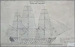 An 1853 drawing of sister ship Velikiy Kniaz Konstantin showing battle damage incurred at the Battle of Sinop.